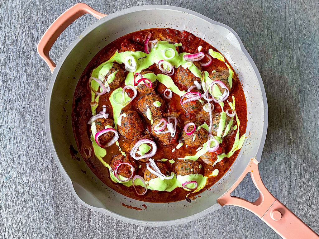 While the tomato sauce is simmering you can prepare the lightly pickled spring onions, kefta meatball, yoghurt sauce. Alternatively, you can also make them in advance and keep them in the fridge until ready to use.